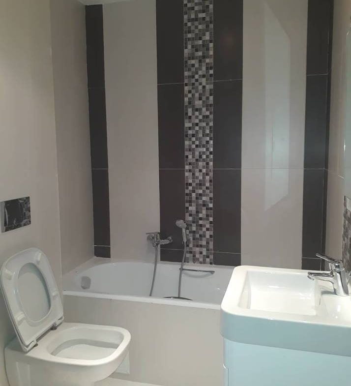 Cet appartement est situé au deuxième étage d’une résidence récemment finie en 2018 munie de deux ascenseurs. L’entrée donne sur un hall qui dessert un salon tapissé en marbre blanc.