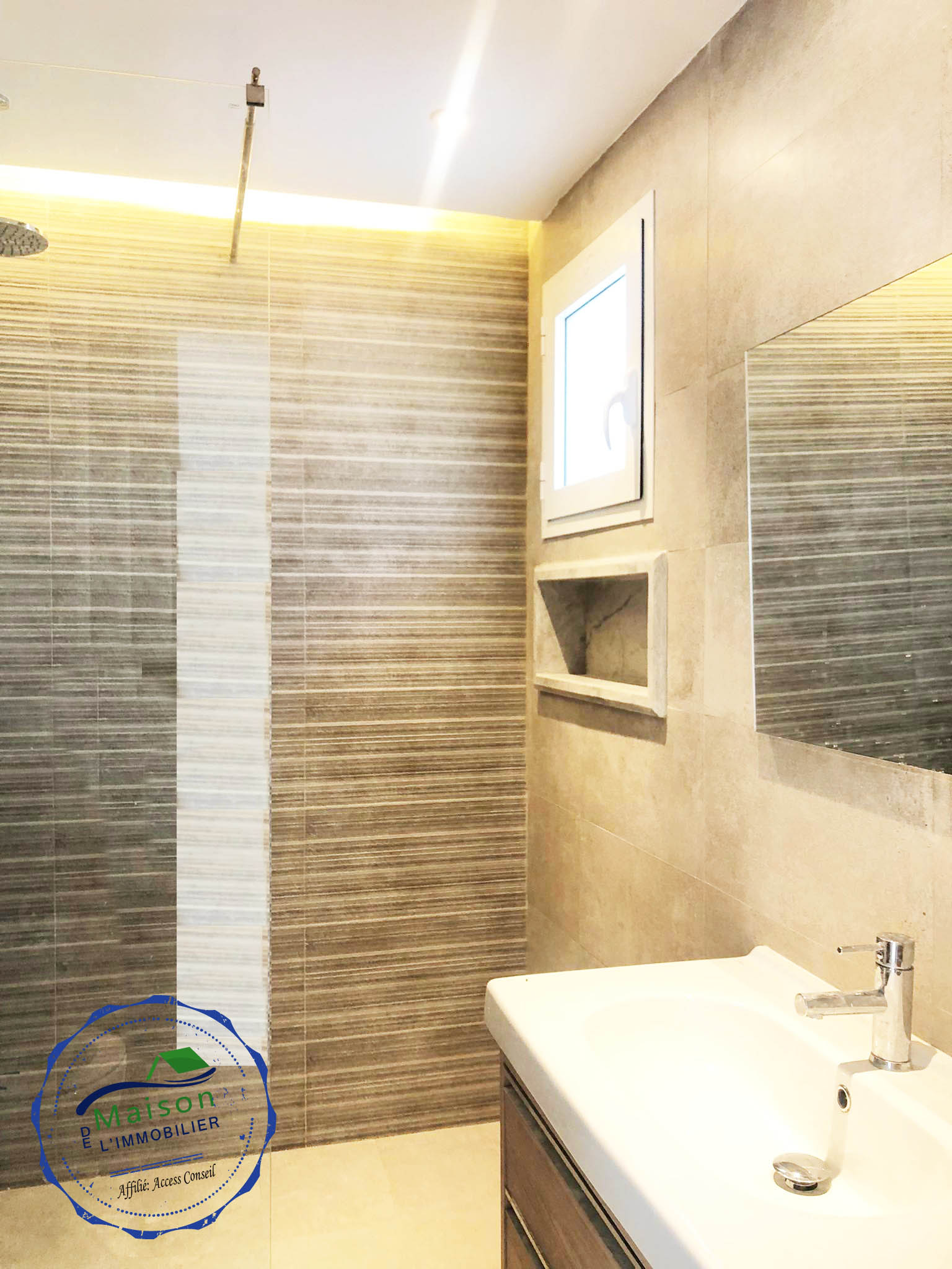 L’entrée donne sur un double salon lumineux grâce à ses ouverture qui donne actes sur la jardin. Une cuisine aménagée et totalement équipée par une plaque, une hotte, un four, un lave vaisselle, une machine à laver et un four miro onde.