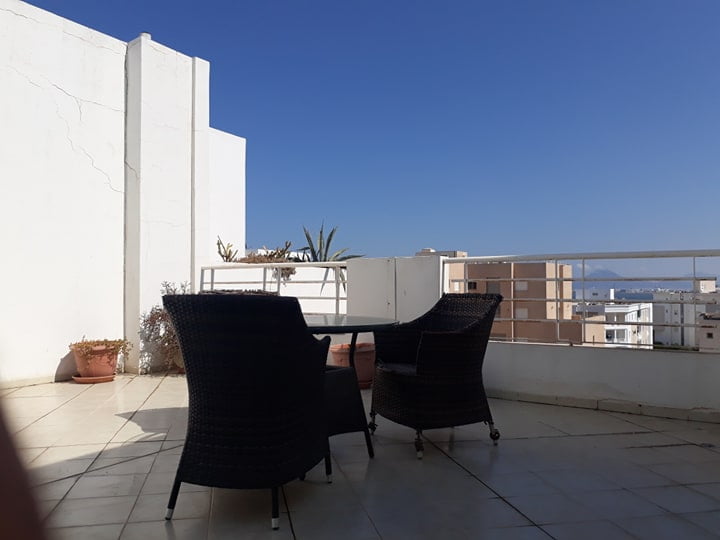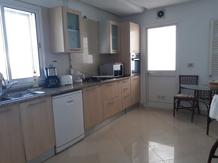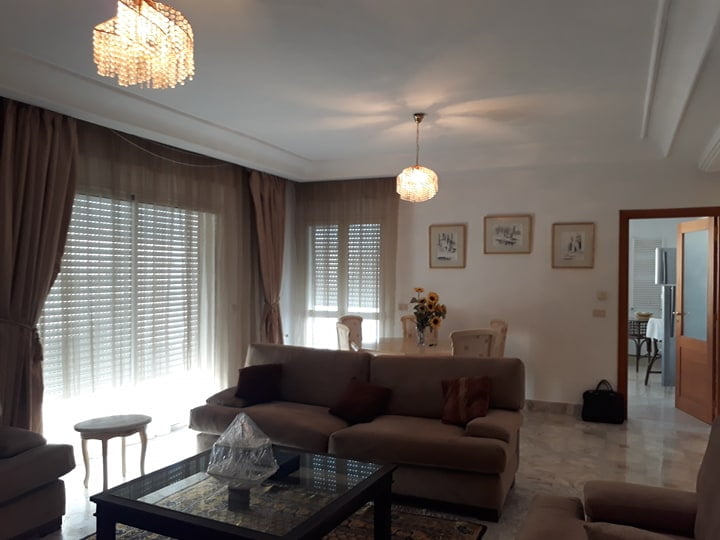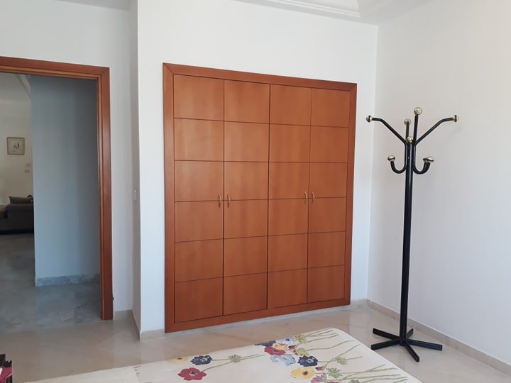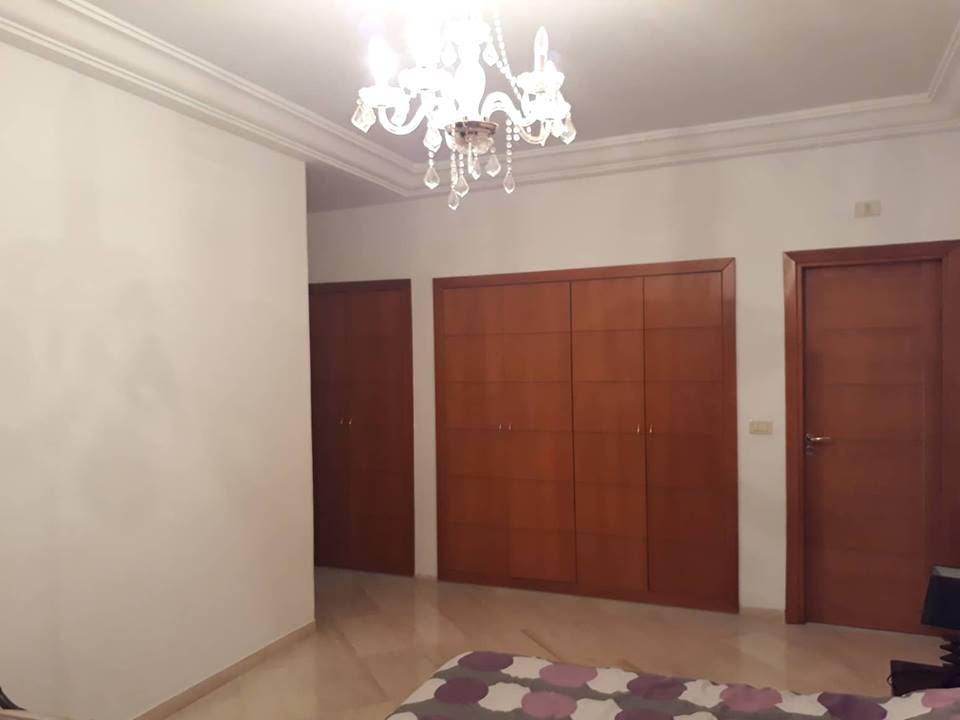 L’entrée dessert un salon revêtu de marbre blanc. il est bien ensoleillé grâce à ses multiples ouvertures, richement meublé, de trois canapés, d’une table basse, d’un téléviseur plasma et une salle à manger donnant sur une terrasse de 40 m. La partie nuit loge trois chambres à coucher dont une suite parentale avec sa propre salle de bain qui dispose d’un lit double, de deux tables de nuit et d’un dressing. les deux autres chambres se partagent une salle de bain. Une place de parking et un cellier sont à disposition. |