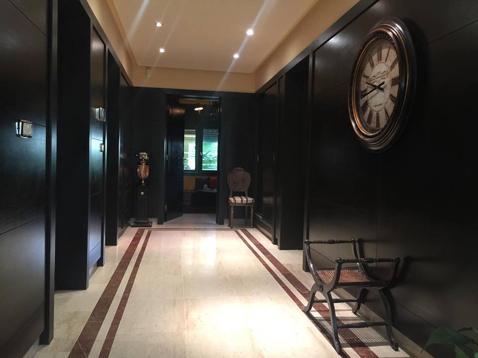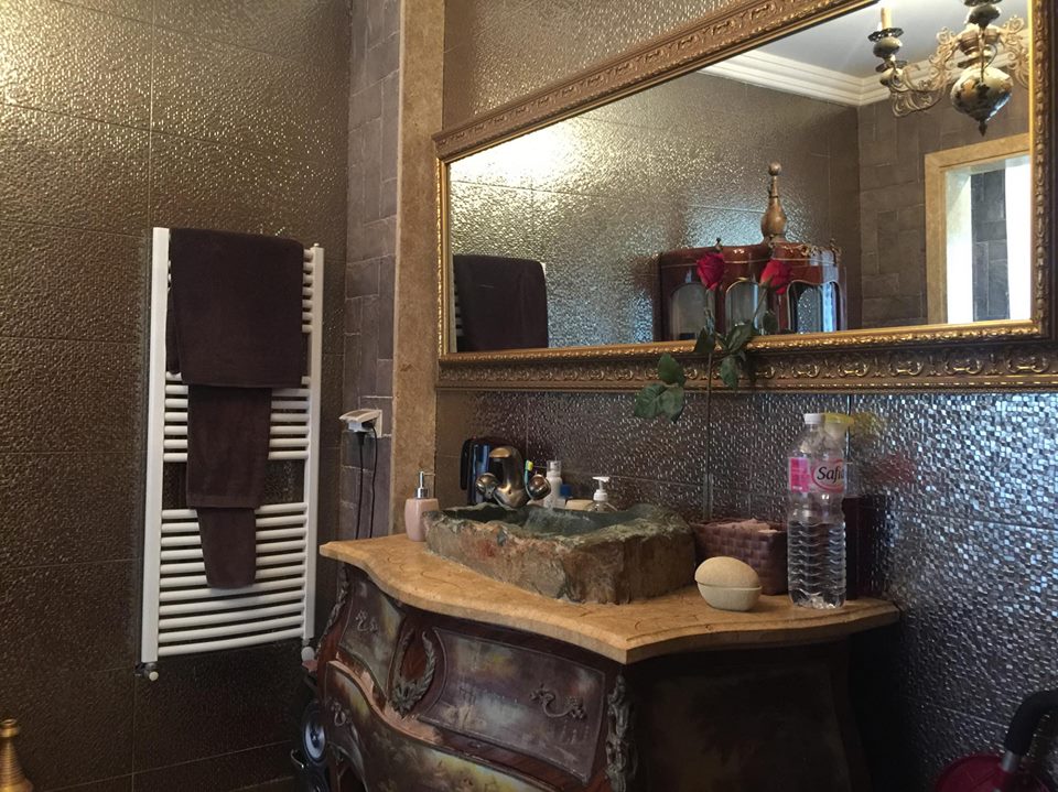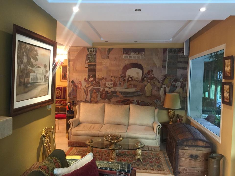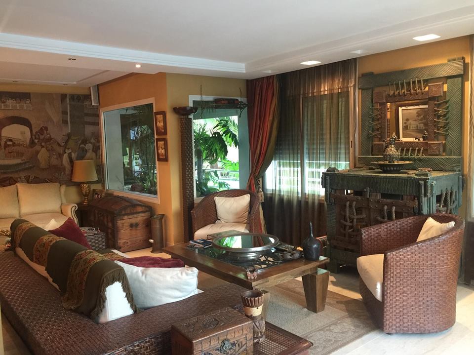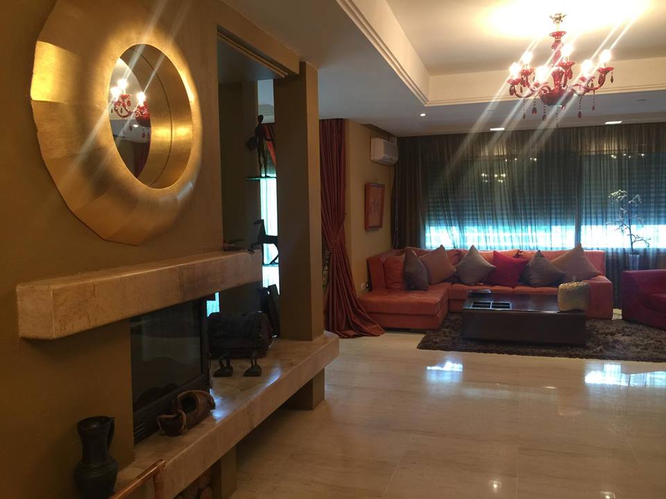 Le rez-de-chaussée abrite un triple salon revêtu de marbre et offrant un accès sur le jardin et la piscine par le biais des ses portes fenêtres en baies-vitrées. Un séjour style arabesque est disponible. Deux cuisines équipées chacune d’une hotte, une plaque, un four, un micro-onde, un réfrigérateur encastré et aménagées par des éléments de rangement. Une salle d’eau et un espace de rangement complètent le compartiment jour.